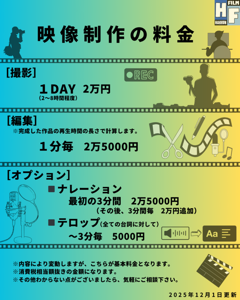 これまで可能な限り料金を変えず映像制作を実施してきましたが、物価高の影響により料金値上げを2026年2月より行います。